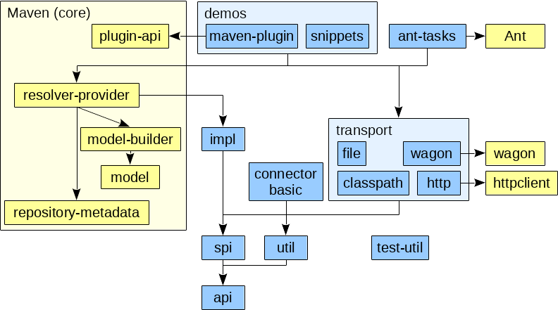 Maven Artifact Resolver 处理本地存储库、远程存储库、开发人员工作区、工件传输和工件解析的规范。预计将通过具体的存储库实现进行扩展,例如 用于 Maven 存储库的Maven Artifact Resolver Provider或用于其他存储库格式的任何其他提供程序。