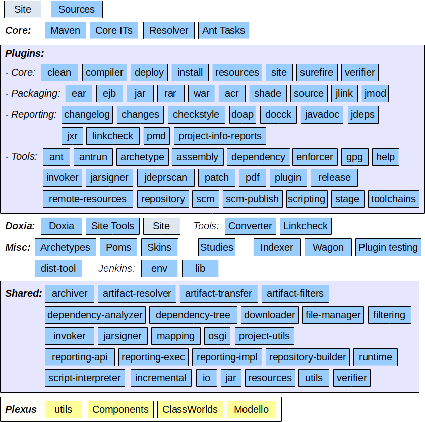 如以下段落所述,Maven 完整源代码在 100 多个 Git 存储库中分派:Maven 核心,还有插件或组件、皮肤、一些 svn2git 只读镜像......