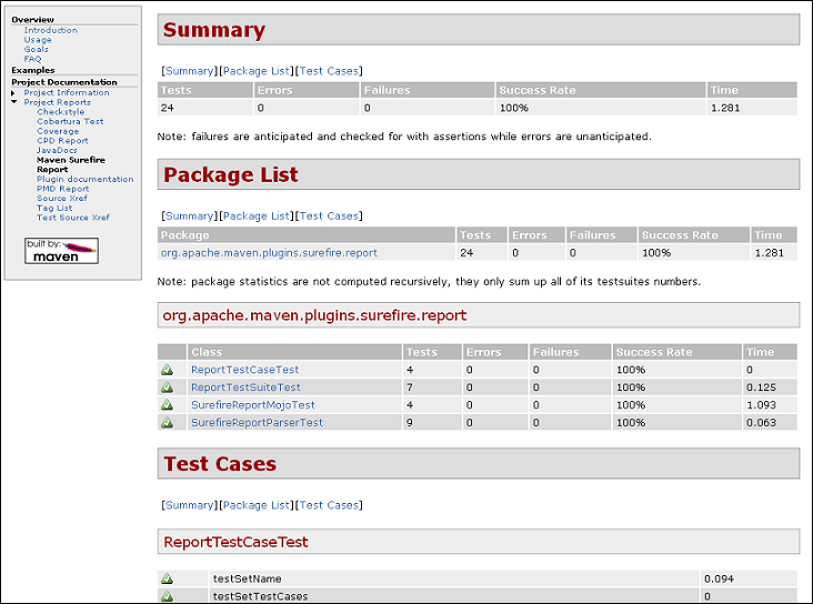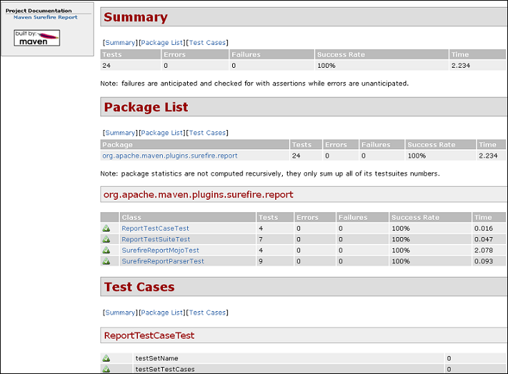 要生成 Surefire 报告作为站点生成的一部分,请在<reporting>您的 POM 部分添加以下内容: